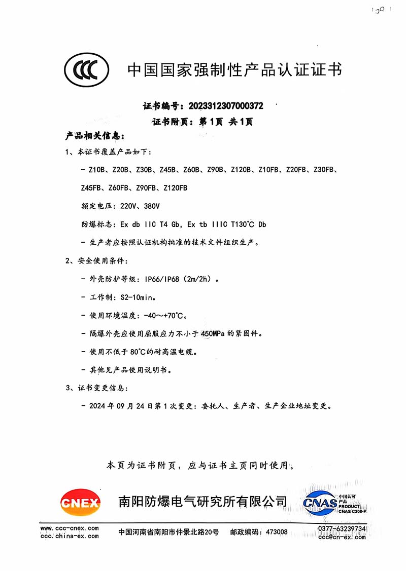 防爆Z10B Z10FB國家強制性產品認證CT4證書109.1